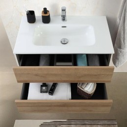 Mobile bagno 75cm sospeso in legno melaminico bianco laccato composto da mobiletto dotato di 2 cassettoni con sistema soft-close per una chiusura ottimale, lavabo in ceramica lucida e specchio con mensola 74x80 cm.