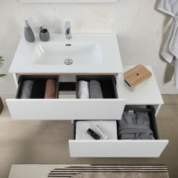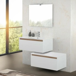 Completo di lavabo in ceramica bianco lucido e specchio a filo con montaggio reversibile. I mobili già assemblati, sono pronti per essere installati.
