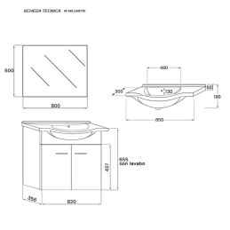 Composto da mobile dotato di 2 ante, lavabo a incasso in ceramica lucida e specchio reversibile.