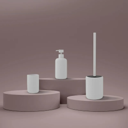 Portascopino bagno da appoggio con superficie cannettata, ideale per completare l’arredo con uno stile moderno e coordinato. Realizzato in ceramica soft-touch bianco opaco, resistente e facile da pulire. Dotato di setole nere anti-igieniche con paraspruzzi, consente una pulizia pratica mantenendo l’ambiente ordinato.