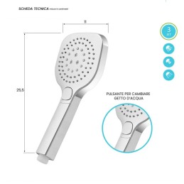 Doccino doccia quadrato effetto cromo lucido. Si distingue dai classici doccini sia per il suo Design a spazzola quadrata sia per il multigetto: dotato di pulsante che alterna 3 tipi di getti d'acqua. Leggero e maneggevole realizzato in ABS materiale che non arrugginisce e facile da pulire. Si monta facilmente a qualsiasi tubo doccia grazie all’attacco...