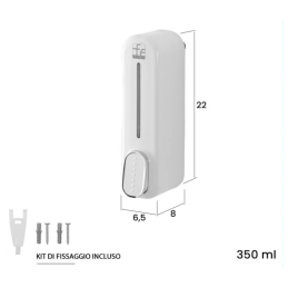 Erogatore di sapone liquido a muro da 350 ml con erogazione a pulsante in plastica di colore bianco per un ambiente bagno sia domestico che pubblico più igienico, pratico e funzionale.