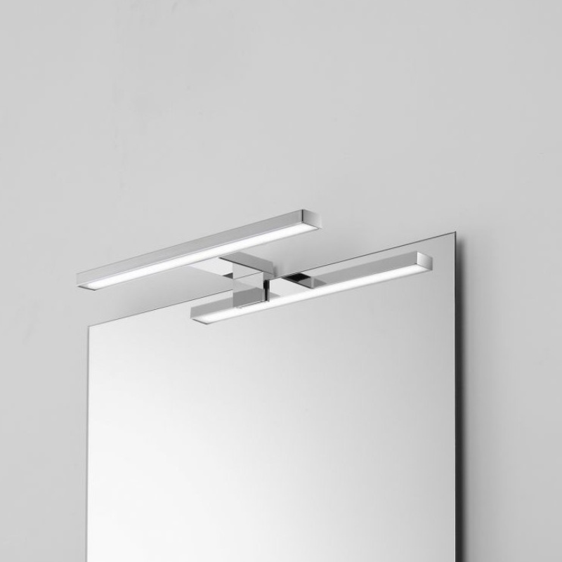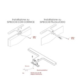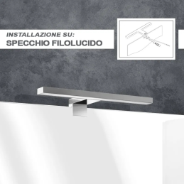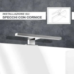 Lampada LED universale 30 cm in ABS cromato per specchi da bagno, tonalità luce naturale 4000k con potenza 5W con trasformatore incluso, doppia modalità di installazione sia su specchi con cornici che su specchi a filo lucido.