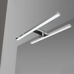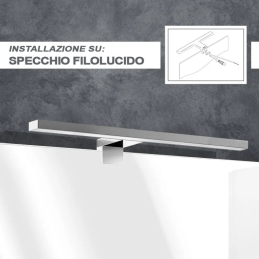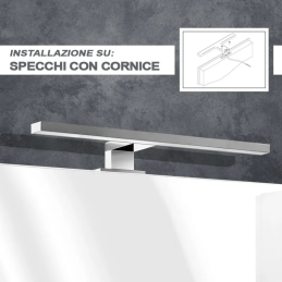 Lampada LED universale 50 cm in ABS cromato per specchi da bagno, tonalità luce naturale 4000k con potenza 5W con trasformatore incluso, doppia modalità di installazione sia su specchi con cornici che su specchi a filo lucido.