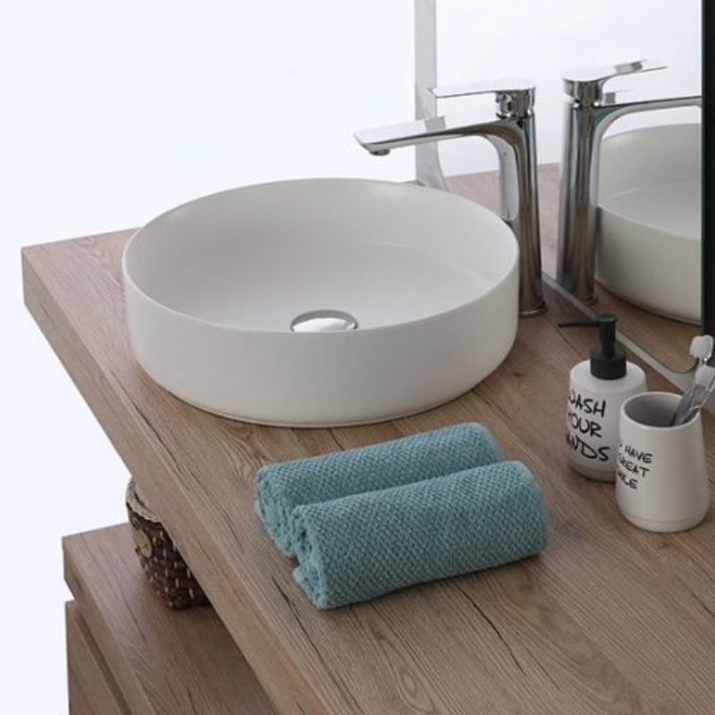 Lavabo tondo in ceramica colore bianco opaco da appoggiare sul piano senza fissaggio, da associare con un rubinetto a canna alta per un bagno in stile moderno.