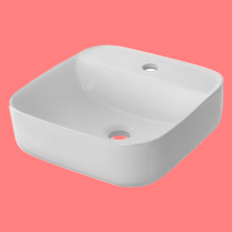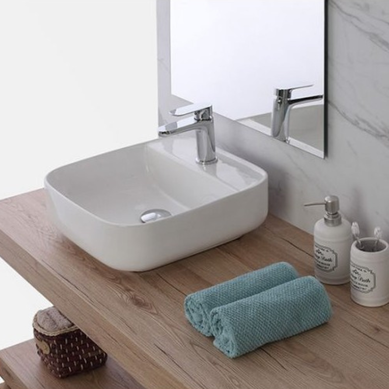 Lavabo quadrato in ceramica colore bianco lucido da appoggiare sul piano senza fissaggio, senza foro troppopieno, con fori per rubinetto e piletta, non inclusi acquistabili separatamente.