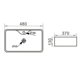 Lavabo rettangolare in ceramica colore bianco lucido da appoggiare sul piano senza fissaggio, senza foro troppopieno, con fori per rubinetto e piletta, non inclusi acquistabili separatamente.