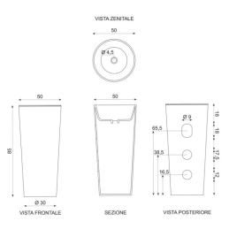 Lavabo freestanding a terra in ceramica colore bianco lucido, monoblocco con libera installazione, con scarico a parete o a pavimento, con foro troppo pieno.