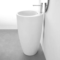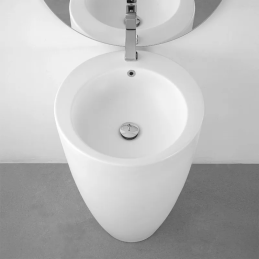 Lavabo freestanding a terra in ceramica colore bianco opaco, monoblocco con libera installazione, con scarico a parete o a pavimento, con foro troppo pieno.