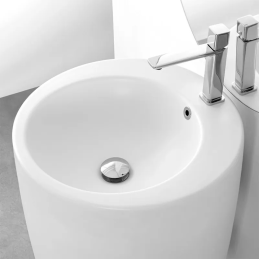 Lavabo freestanding a terra in ceramica colore bianco lucido, monoblocco con libera installazione, con scarico a parete o a pavimento, con foro troppo pieno.