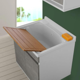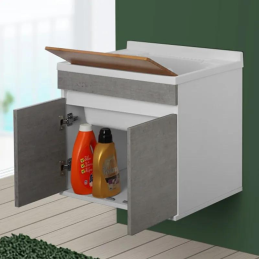 Lavatoio sospeso in legno melaminico colore bianco con 2 ante colore grigio cemento con sistema slow motion per una chiusura ottimale, 1 ripiano nella cassa, completo di vasca in resina, sifone e asse lavapanni in legno.