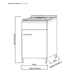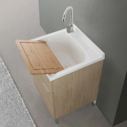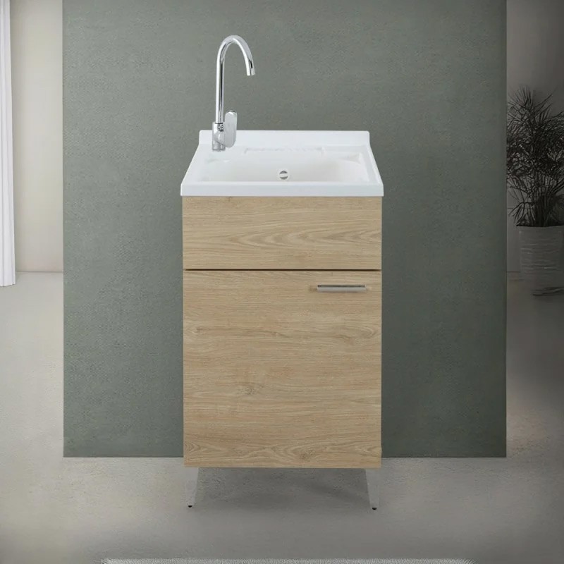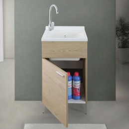 Lavatoio a terra in legno melaminico colore Rovere dolomite con 1 anta, 1 ripiano nella cassa, completo di vasca in resina, sifone e asse lavapanni in legno.