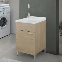 Lavatoio a terra in legno melaminico colore Rovere dolomite con 1 anta, 1 ripiano nella cassa, completo di vasca in resina, sifone e asse lavapanni in legno e piedini in ABS.