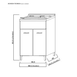 Lavatoio a terra in legno melaminico colore Bianco frassinato con 2 ante. Completo di vasca in ceramica bianca lucida avente strizzatoio laterale e pozzetto, sifone di scarico e piedini in ABS cromato lucido. Disponibile in diverse colorazioni e finiture superficiali. N.B. Rubinetteria acquistabile a parte.