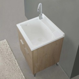 Lavatoio a terra in legno melaminico colore Rovere dolomite con 2 ante, completo di vasca in resina, sifone e asse lavapanni in legno e piedini in ABS.