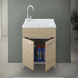 Lavatoio a terra in legno melaminico colore rovere chiaro con 2 ante con sistema slow motion per una chiusura ottimale, 2 ripiani nella cassa, completo di vasca in resina, sifone e asse lavapanni in legno.