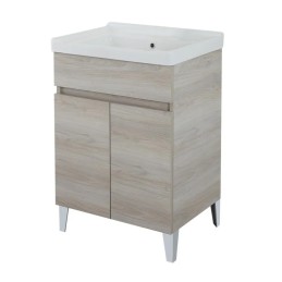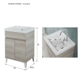 Lavatoio a terra in legno melaminico colore Rovere dolomite con 2 ante. Completo di vasca in ceramica bianca lucida avente strizzatoio laterale e pozzetto, sifone di scarico e piedini in ABS cromato lucido. Disponibile in diverse colorazioni e finiture superficiali. N.B. Rubinetteria acquistabile a parte.
