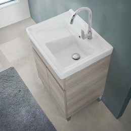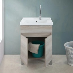 Lavatoio a terra in legno melaminico colore Rovere grigio con 2 ante. Completo di vasca in ceramica bianca lucida avente strizzatoio laterale e pozzetto, sifone di scarico e piedini in ABS cromato lucido. Disponibile in diverse colorazioni e finiture superficiali. N.B. Rubinetteria acquistabile a parte.