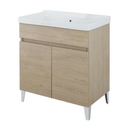 Lavatoio a terra in legno melaminico colore Rovere dolomite con 2 ante. Completo di vasca in ceramica bianca lucida avente strizzatoio laterale e pozzetto, sifone di scarico e piedini in ABS cromato lucido. Disponibile in diverse colorazioni e finiture superficiali. N.B. Rubinetteria acquistabile a parte.