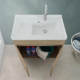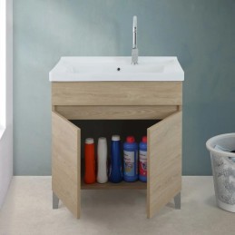 Lavatoio a terra in legno melaminico colore rovere chiaro con 2 ante con sistema slow motion per una chiusura ottimale, 2 ripiani nella cassa, completo di vasca in resina, sifone e asse lavapanni in legno.