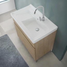 Lavatoio a terra in legno melaminico colore Rovere dolomite con 1 anta, 1 ripiano nella cassa, completo di vasca in resina, sifone e asse lavapanni in legno.