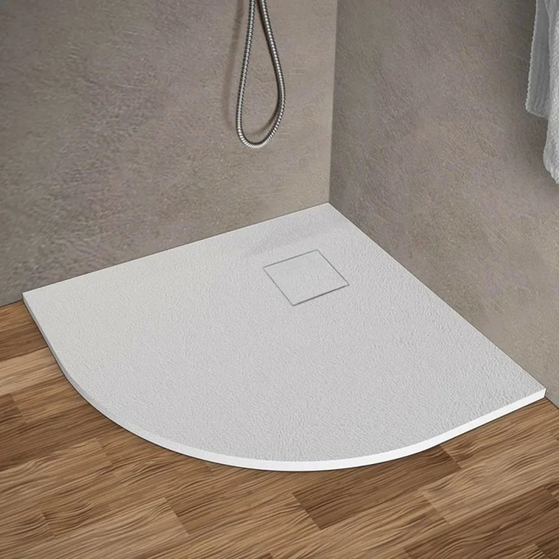 Piatto doccia 80 x 80 cm a forma semicircolare dal colore bianco e la superficie di contatto dall'effetto pietra.