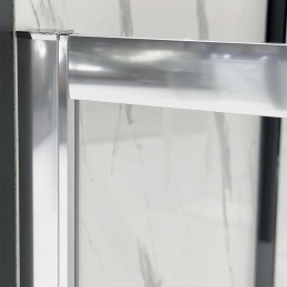 Parete doccia in vetro con porta scorrevole di cristallo temperato trasparente da 5 mm di spessore.