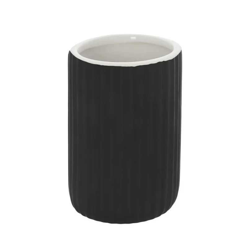 Bicchiere multiuso portaspazzolini da appoggio con superficie cannettata, ideale per organizzare gli accessori sul lavabo. Realizzato in ceramica soft-touch con finitura bianco opaco, resistente e facile da pulire, per un look coordinato e uniforme in bagno. Funzionale e versatile, può contenere spazzolini, pennelli e piccoli oggetti.