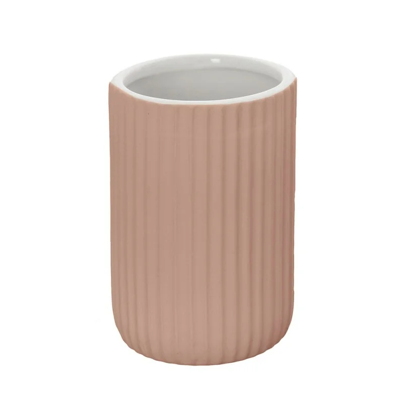 Bicchiere multiuso portaspazzolini da appoggio con superficie cannettata, ideale per organizzare gli accessori sul lavabo. Realizzato in ceramica soft-touch con finitura bianco opaco, resistente e facile da pulire, per un look coordinato e uniforme in bagno. Funzionale e versatile, può contenere spazzolini, pennelli e piccoli oggetti.