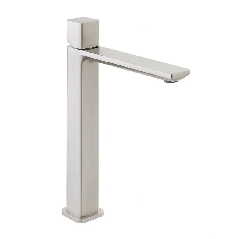 Miscelatore alto per lavabo in ottone con raffinata finitura in nichel spazzolato, ideale per chi cerca un rubinetto bagno moderno dal design minimalista ed elegante.