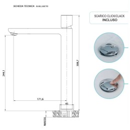 Fornito di scarico universale con piletta click-clack in acciaio. Per chiudere e aprire il tappo: basta un dito.