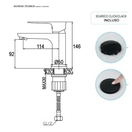 Completo di tappo di scarico abbinato del tipo clic/clac ovvero l'apertura e la chiusura avviene tramite pressione diretta sul tappo: basta un dito.