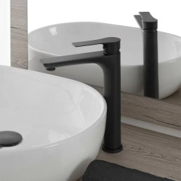 Miscelatore alto 29.5 cm per lavabo dalla forma tonda costruita in acciaio di colore nero opaco. Completo di tappo di scarico abbinato del tipo clic/clac ovvero l'apertura e la chiusura avviene tramite pressione diretta sul tappo: basta un dito. Il montaggio è facilitato dalla presenza nella confezione dei flessibili di collegamento di tipo standard...