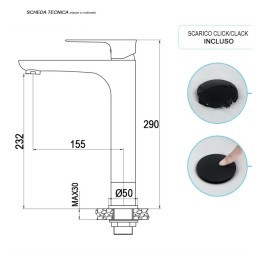 Completo di tappo di scarico abbinato del tipo clic/clac ovvero l'apertura e la chiusura avviene tramite pressione diretta sul tappo: basta un dito.