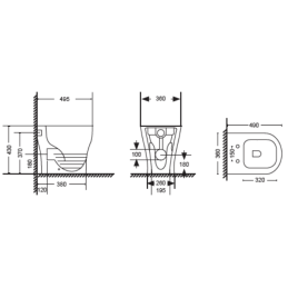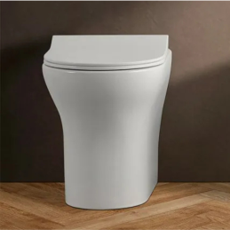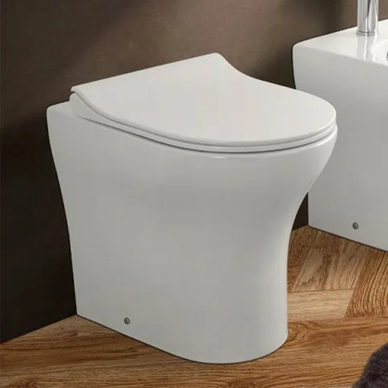 Vaso WC a terra in ceramica bianca lucida senza brida, installazione filo muro con scarico a parete o a pavimento, kit di fissaggio incluso, kit di scarico non incluso.