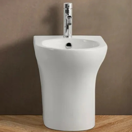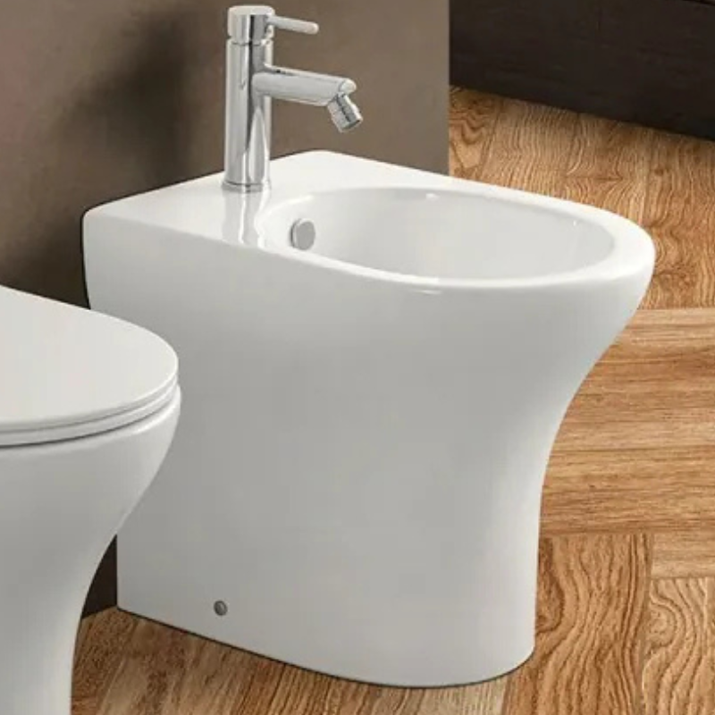Bidet a terra in ceramica bianca lucida senza brida, installazione filo muro con kit di fissaggio incluso.