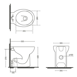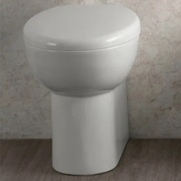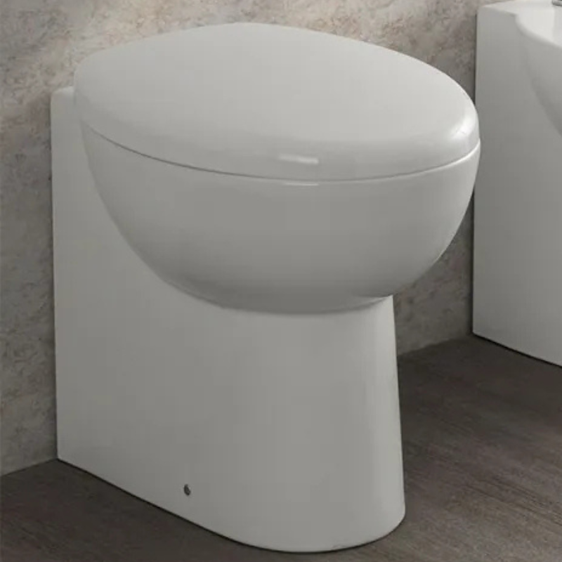 Vaso WC a terra in ceramica bianca lucida senza brida, installazione filo muro con scarico a parete o a pavimento, kit di fissaggio incluso, kit di scarico non incluso.