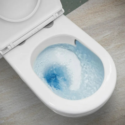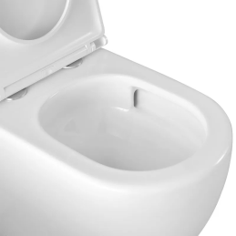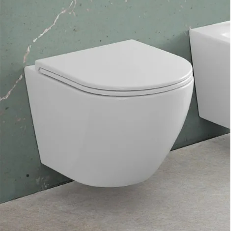 Vaso WC sospeso in ceramica bianca lucida senza brida, installazione sospeso a parete con scarico interno a vortice, kit di fissaggio incluso.