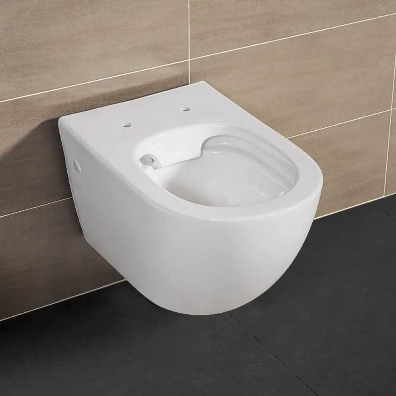 Vaso WC sospeso in ceramica bianca lucida senza brida, installazione e scarico a parete con staffe di fissaggio non incluse acquistabili separatamente.