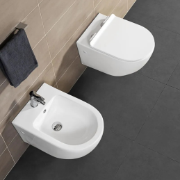 Bidet sospeso in ceramica bianca lucida senza brida, installazione a parete con staffe di fissaggio non incluse.