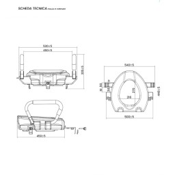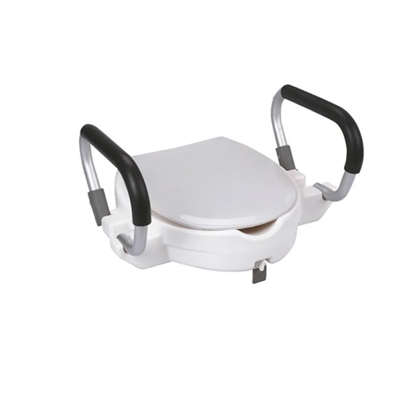 Sedile rialzato universale per WC con braccioli di sostegno in alluminio rivestiti con gomma per una presa sicura antiscivolo.
