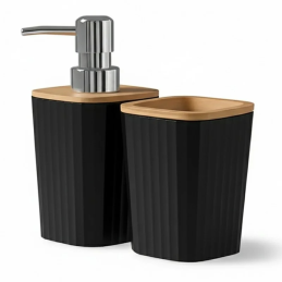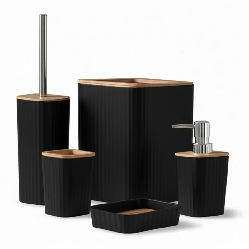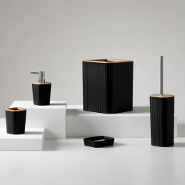 Il set accessori bagno Show da 5 pezzi, in plastica colore nero con dettagli in bambù, unisce funzionalità e design moderno.