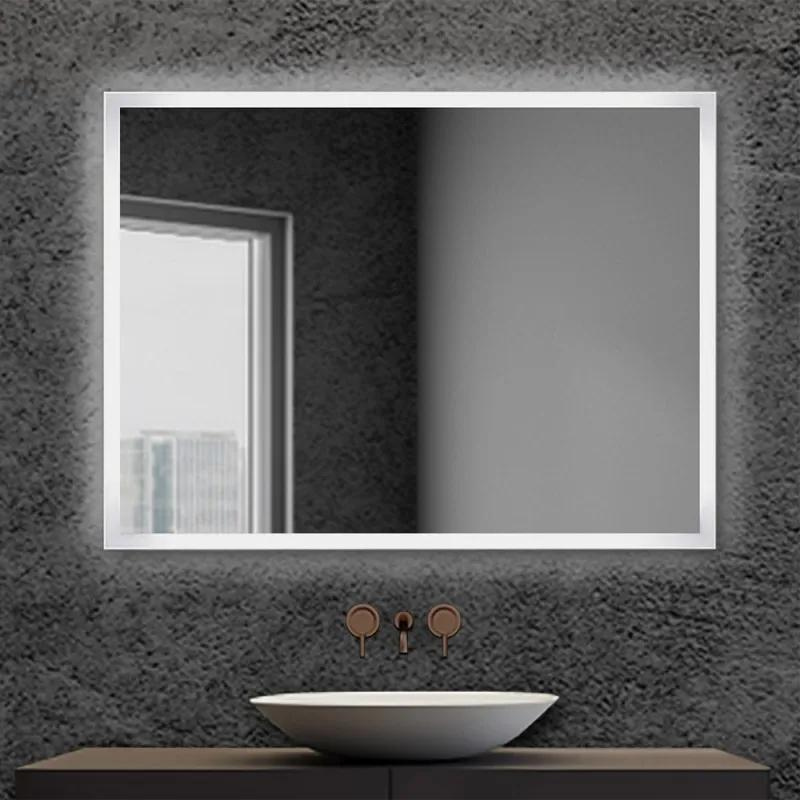 Specchio rettangolare 60x80 cm da bagno con cornice illuminata da LED integrato, temperatura colore luce naturale 4000k, installazione a parete reversibile con staffe incluse, trasformatore incluso per collegamento a corrente senza pulsante ON/OFF, grado di protezione IP44, potenza 25w.