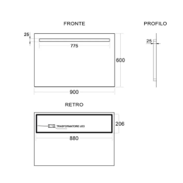 Specchio rettangolare 60x90 cm da bagno con 1 fascia illuminata da LED integrato, temperatura colore luce naturale 4000k, installazione a parete reversibile con staffe incluse, trasformatore incluso per collegamento a corrente senza pulsante ON/OFF, grado di protezione IP44, potenza 8w.