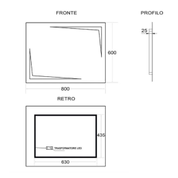 Specchio rettangolare 60x80 cm da bagno con cornice slim obliqua illuminata da LED integrato, temperatura colore luce naturale 4000k, installazione a parete reversibile con staffe incluse, trasformatore incluso per collegamento a corrente senza pulsante ON/OFF, grado di protezione IP44, potenza 23w.
