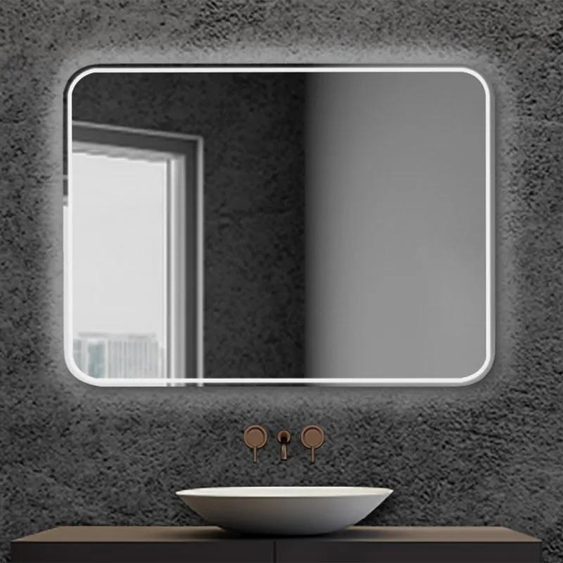 Specchio rettangolare 60x80 cm da bagno con angoli arrotondati e cornice slim illuminata da LED integrato, temperatura colore luce naturale 4000k, installazione a parete reversibile con staffe incluse, trasformatore incluso per collegamento a corrente senza pulsante ON/OFF, grado di protezione IP44, potenza 25w.