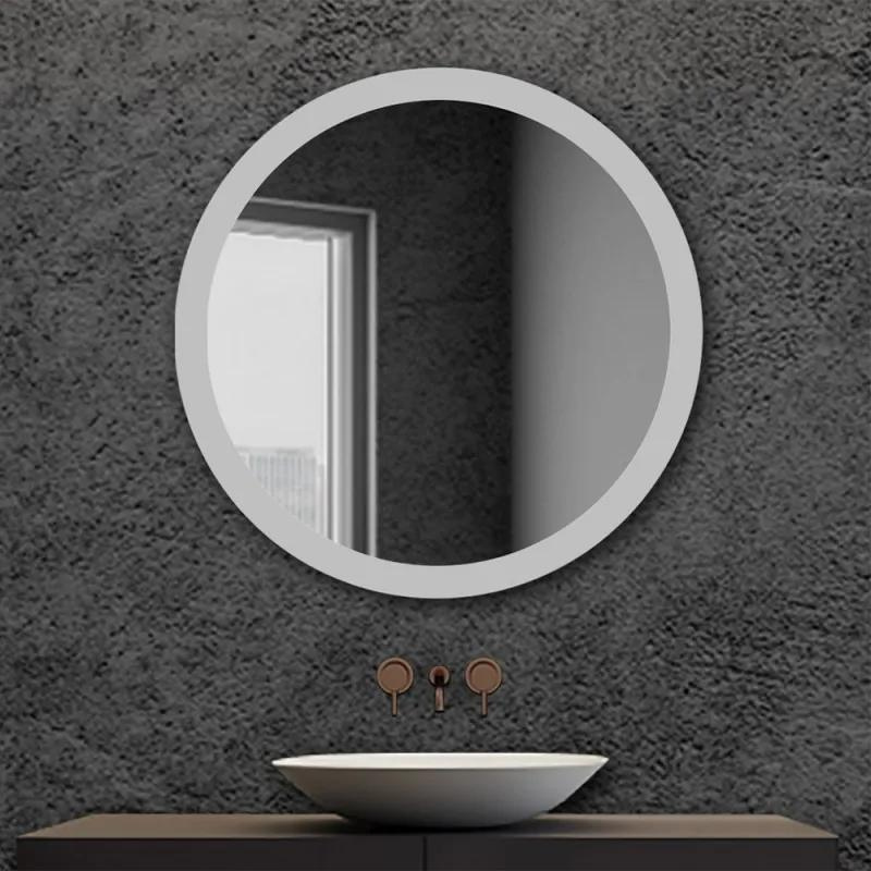 Specchio Tondo 70cm di diametro da bagno con cornice illuminata da LED integrato, temperatura colore luce naturale 4000k, installazione a parete con staffe incluse, trasformatore incluso per collegamento a corrente senza pulsante ON/OFF, grado di protezione IP44, potenza 20w.